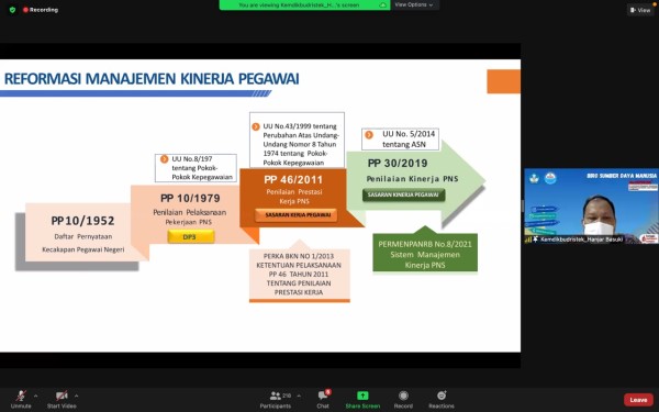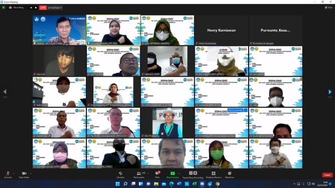HumasUPNVJ - For an institution or organization, the supporting factors for success are not limited to large capital or sophisticated technology. Human resources are one of the factors that also play a role in supporting the success of the institution. However, this will not materialize if HR is not managed properly and correctly. So that the management of human resources must really be a concern if an institution wants to develop. Related to the importance of managing human resources, on Wednesday (22/12/2021) a socialization of Employee Performance Targets (SKP), Human Capital Development Plan , Career First Aid and Open Bidding Procedures was held in a hybrid manner, namely online and offline. This event presented several speakers, namely; Drs. Zainal Arifin as Associate Expert Staffing Analyst for the HR Bureau of the Ministry of Education and Culture and Higher Education, Diah Candrawati, SH,.MH, Policy analysis Associate Expert for the HR Bureau of the Ministry of Research and Technology and Hanjar Basuki, S.Kom, MM.