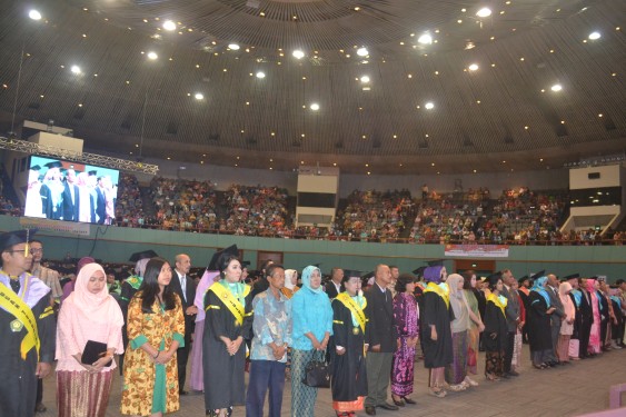 Acara diawali dengan menyanikan lagu Indonesia raya, bela negara baru kemudian pembukaan senat serta sambutan-sambutan dari rector, perwakilan kemenristek dikti dilanjutkan dengan prosesi yang cukup khidmat. Para wisudawan menaiki panggung untuk penerimaan map dan prosesi wisuda oleh rector. Dalam acara tersebut terpampang biodata mahasiswa mereka secara lengkap pada layar depan, bersamaan dengan itu, video live pada layar belakang agar para wali dan orang tua serta keluarga wisudawan dapat melihat jelas anak-anak mereka tampil ke atas panggung, kebanggaan dalam sebuah keluarga yang telah berhasil meraih gelar diploma, sarjana, profesi atau bahkan hingga magister.
