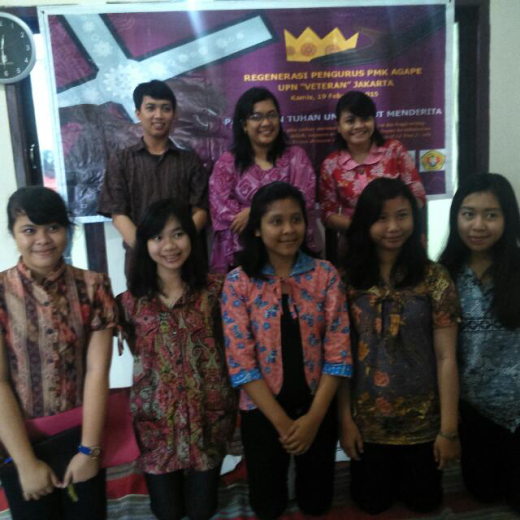 Persekutuan Mahasiswa Kristen (PMK) Universitas Pembangunan Nasional “Veteran” Jakarta selalu memiliki kerinduan untuk melaksanakan Ibadah Persekutuan Jumat, Persekutuan Doa Jemaat di setiap minggunya. Dimana sesuai dengan namanya Pesekutuan Jumat diadakan setiap hari jumat siang sekitar jam 11.20 WIB yang bertempatan di ruangan Auditorium lantai 4. Sedangkan Persekutuan Doa Jemaat diadakan di hari dan jam yang disesuaikan dengan waktu perkuliahan mahasiswa. Persekutuan Doa Jemaat bertempat di Sekretariat Unit Kerja Mahasiswa (UKM) Agape di lantai dasar gedung Fakultas Ilmu Komputer. Kemudian pada acara perayaan ibadah setiap tahunnya diadakan Ibadah Peringatan Paskah, Kebaktian Kebangunan Rohani, dan juga Ibadah Perayaan Natal. Disamping itu PMK Agape juga mempunyai perogram kerja untuk membina mahasiswa kedalam bentuk Kelompok Kecil (KK). Ini merupakan kegiatan pembangunan rohani bagi mahasiwa yang ikut kedalam Kelompok Kecil tersebut.